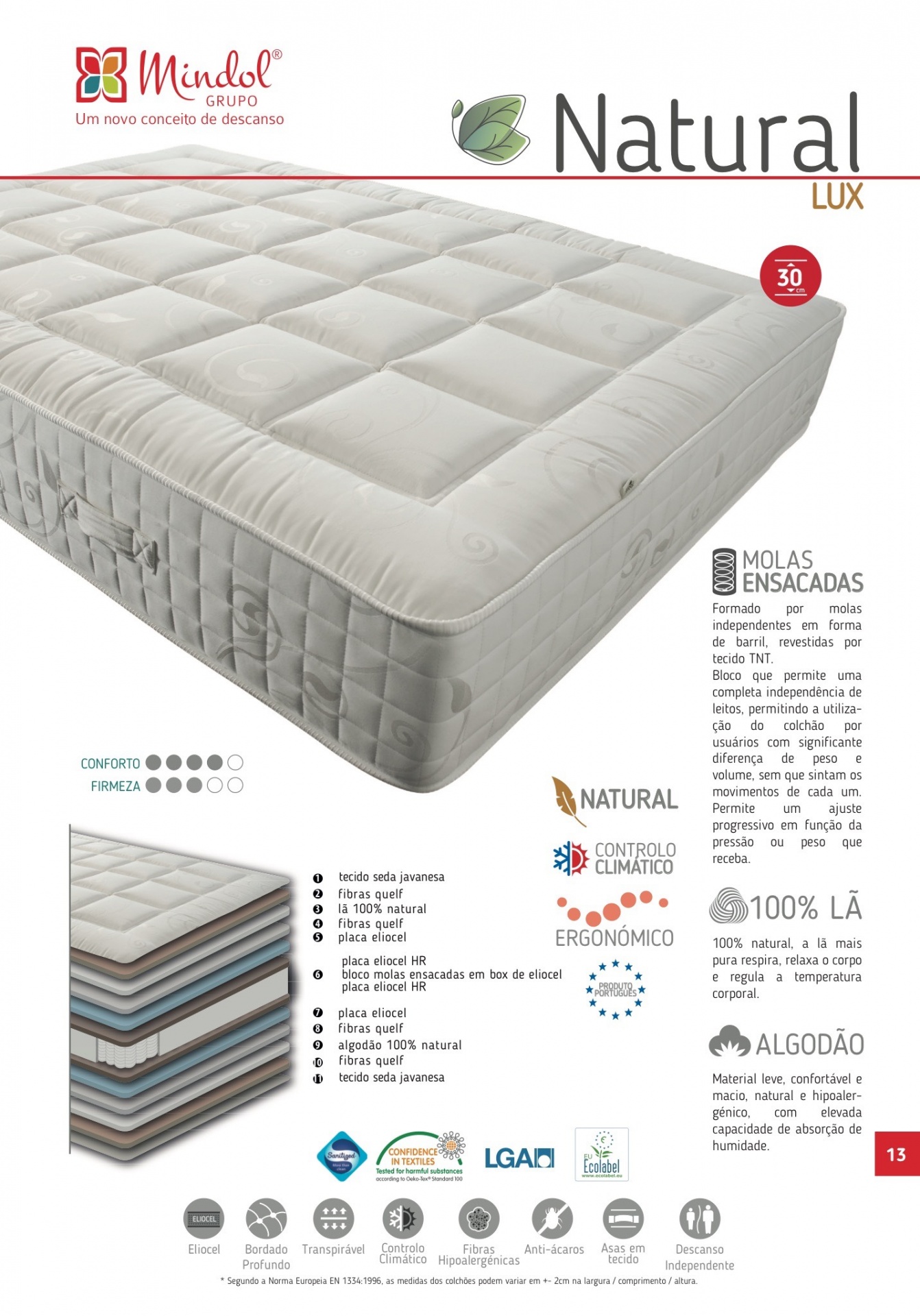 O colchão VERÃO e INVERNO! Colchão Natural, um aspeto luxuoso com um nível de conforto único. Colchão de mola ensacada, com acolchoado de Algodão e lã. Acabamentos e materiais de qualidade superior com tecido em seda javanesa. Perfeito para casais que gostam de dormir envolvidos no colchão e que procuram independência de movimentos.