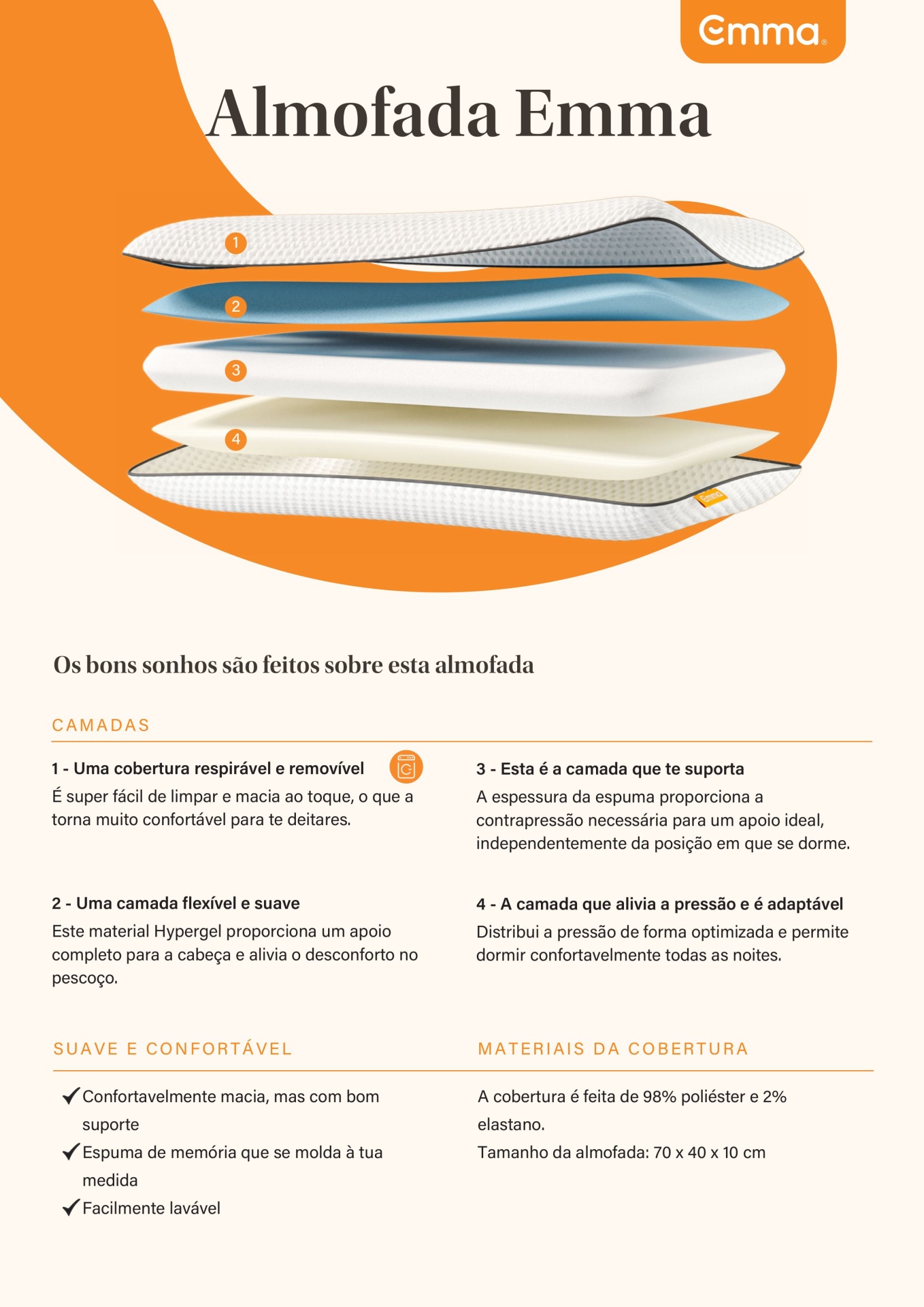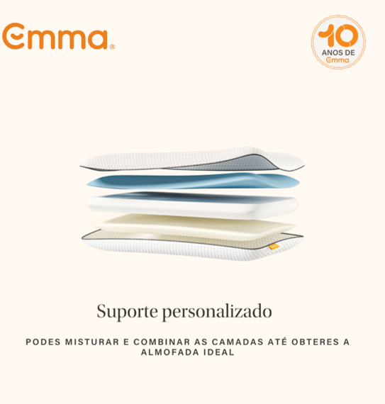 Foi por isso que criámos a Almofada Emma para ti: vem com camadas de espuma removíveis que podes facilmente ajustar para uma altura e firmeza ideais.