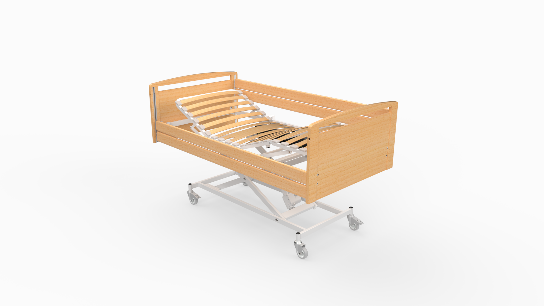 Cama com carro elevador de regulação eléctrica, tripartida em 4 secções, de grande funcionalidade. Permite através da sua elevação comandada electricamente uma maior autonomia do doente (maior facilidade em entrar e sair da cama) e melhora significativamente as condições para as prestações dos cuidados médicos. Facilita também as viragens dos utilizadores e as transferências para cadeiras.
