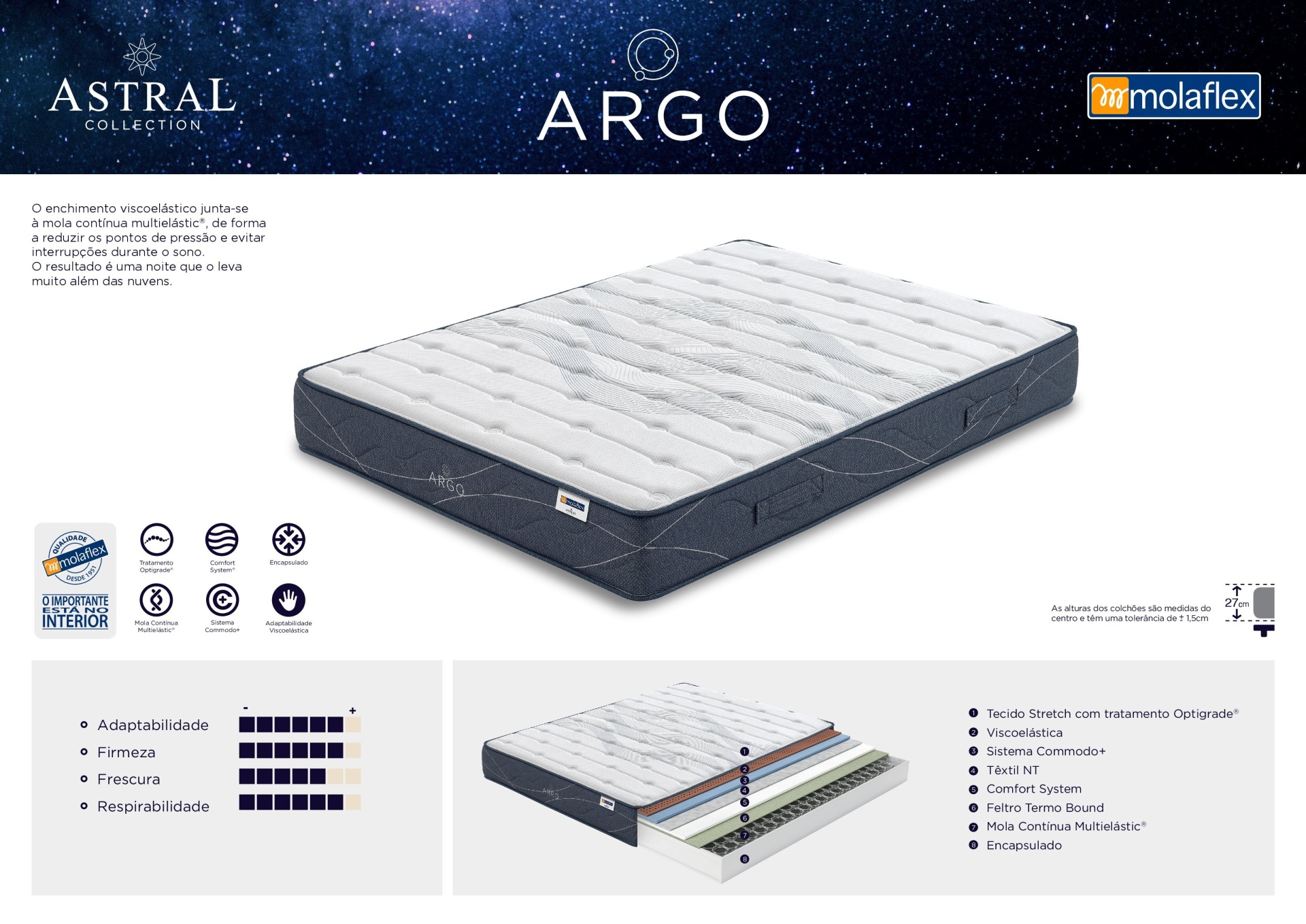 O Colchão Molaflex Argo resulta da combinação da mola contínua multielástic® com o enchimento de espuma viscoelástico que reduz os pontos de pressão e evita interrupções durante o sono.