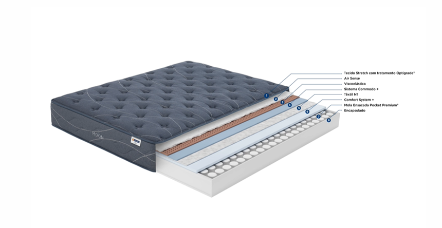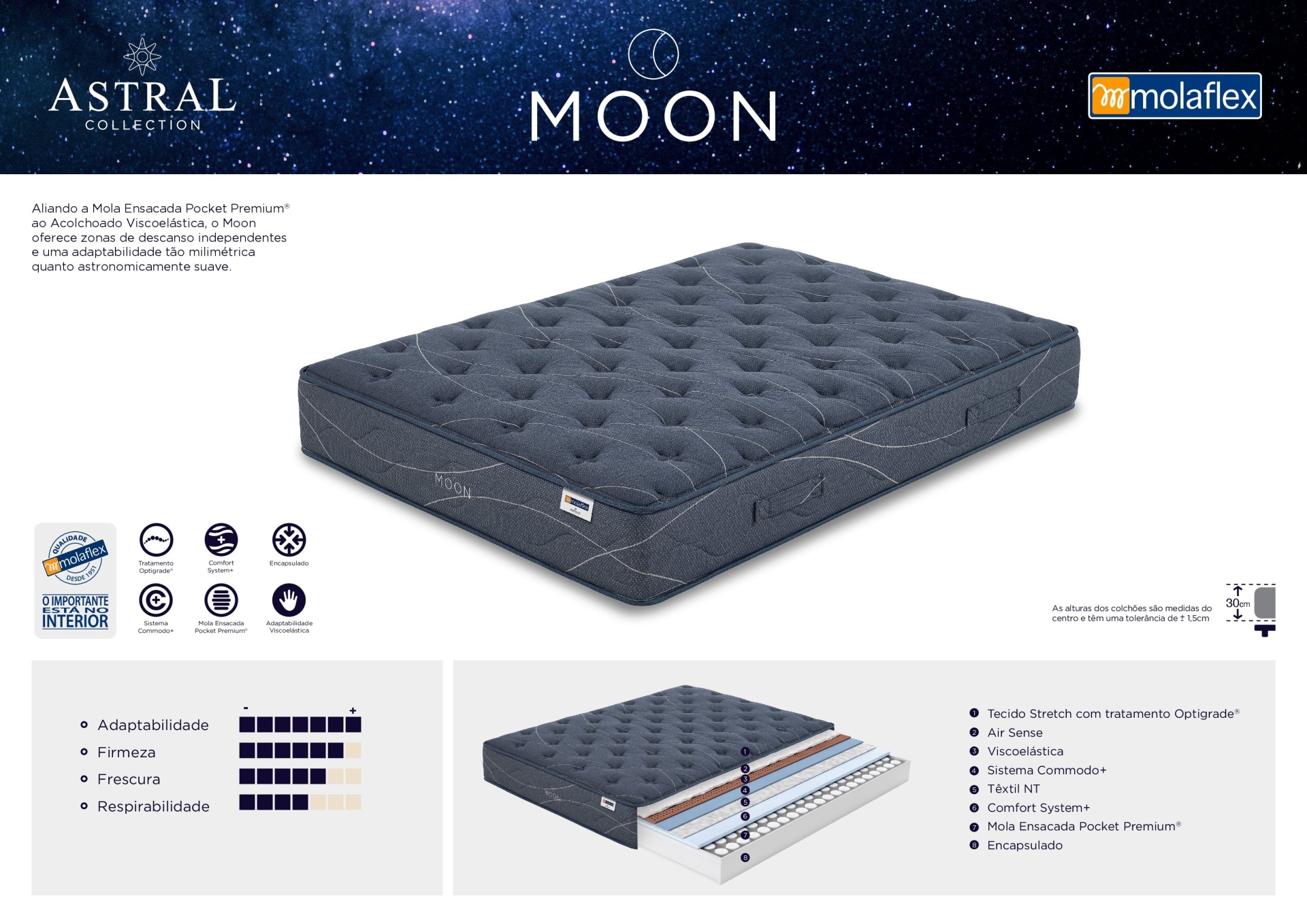 Aliando a Mola Ensacada Pocket Premium® ao Acolchoado Viscoelástica, o Moon oferece zonas de descanso independentes e uma adaptabilidade tão milimétrica quanto astronomicamente suave.