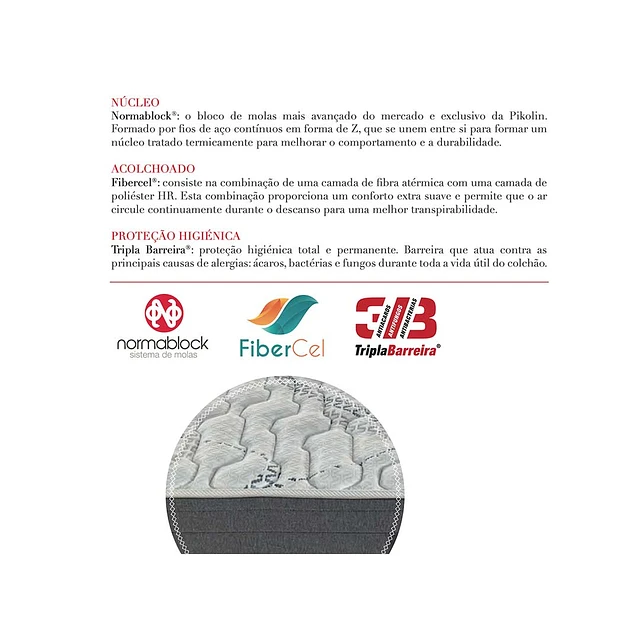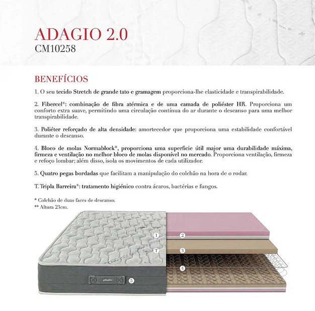 O Colchão Pikolin Adagio é um colchão de combinação perfeita entre molas e funcionalidade para o seu descanso. O modelo Adagio de mola de fio contínuo Normablock oferece um conforto suave e fresco graças à sua camada de Fibercel que combina fibra atérmica com fibra de poliéster altamente respirável. O seu bloco de molas de fio contínuo Normablock, o mais respirável do mercado, transforma o modelo Adagio num colchão que oferece um alto nível de respirabilidade, além de uma sensação de higiene e frescura durante o sono.