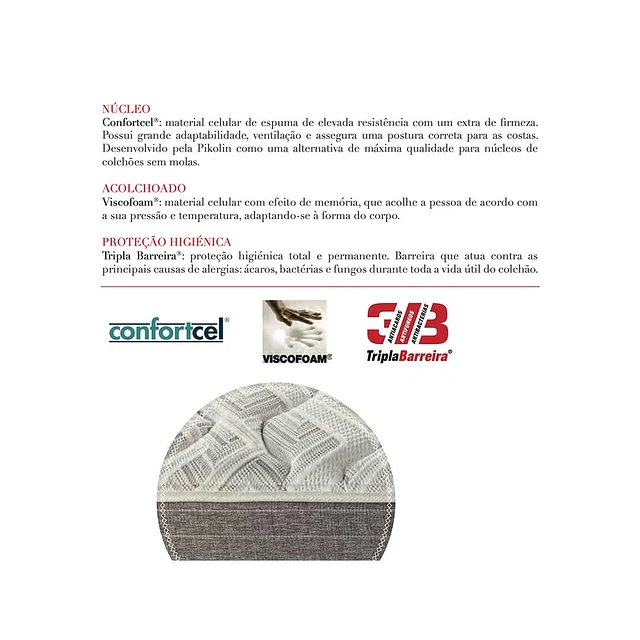 Confortcel®: material celular de espuma de elevada resistência com um extra de firmeza. Possui grande adaptabilidade, ventilação e assegura uma postura correta para as costas. Desenvolvido pela Pikolin como uma alternativa de máxima qualidade para núcleos de colchões sem molas.