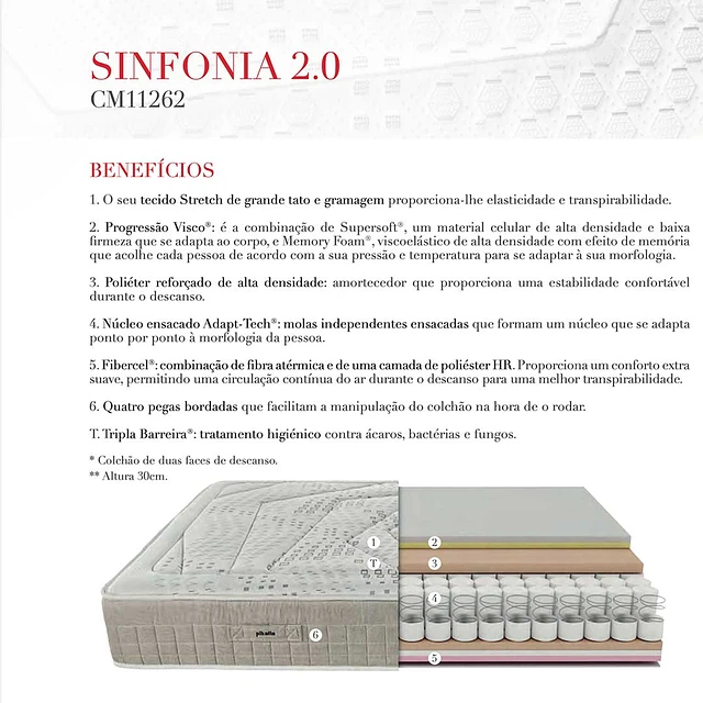 O Colchão Pikolin Sinfonia é um colchão de molas ensacadas Sinfonia combina o núcleo Adapt-Tech com a tecnologia de acolchoado Progression Fiber. O seu núcleo de molas ensacadas Adapt-Tech adapta-se perfeitamente ao peso corporal do utilizador, e a sua tecnologia de acolchoado Progression Fiber combina espuma HR Supersoft e fibra de poliéster para proporcionar um primeiro contacto suave e macio enquanto dorme. Desta forma, o modelo Sinfonia combina uma grande adaptabilidade, com efeito de memória e conforto progressivo, com a estabilidade que precisa durante o descanso, graças ao seu amortecedor de poliéster reforçado de alta densidade.