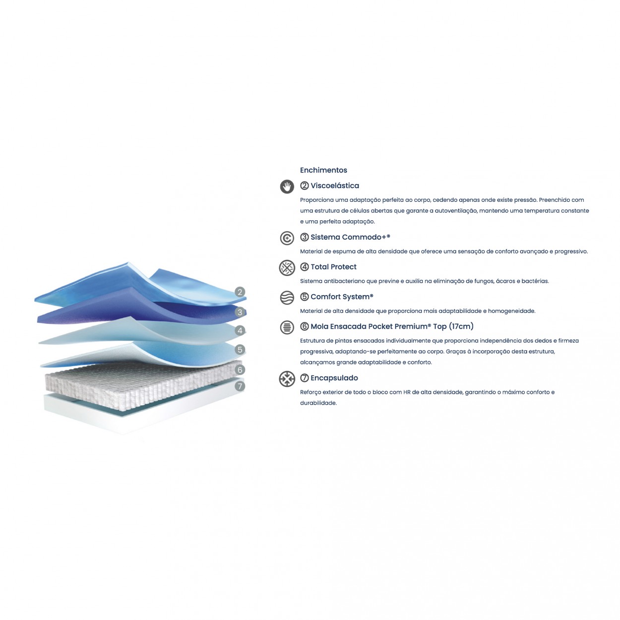 A estrutura de Molas Ensacadas Pocket Premium® Top (17 cm) garante uma firmeza progressiva e uma excelente independência de leitos, adaptando-se de forma individualizada aos contornos do corpo. Esta tecnologia garante suporte eficaz e conforto personalizado, ideal para quem procura uma sensação de firmeza equilibrada durante o sono.